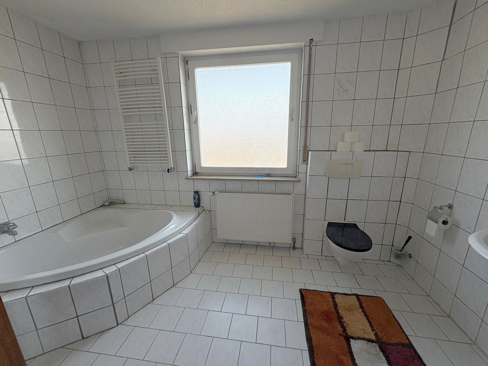 - das Badezimmer im Obergeschoss hat eine Eckbadewanne und separate Dusche
