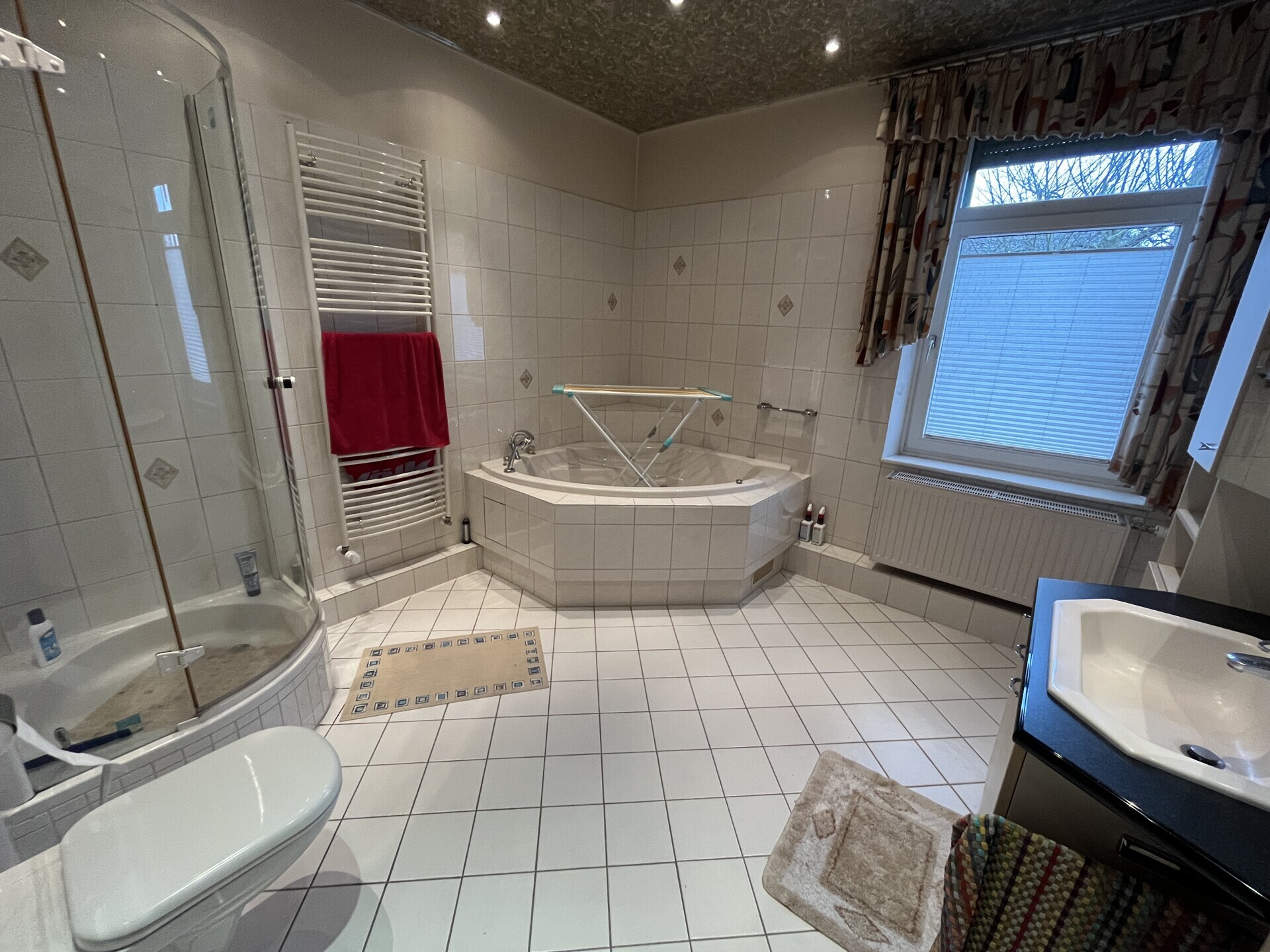 - großes Bad im Erdgeschoss mit Whirlpool-Badewanne, Dusche, Handtuchheizkörper, Waschbecken und WC