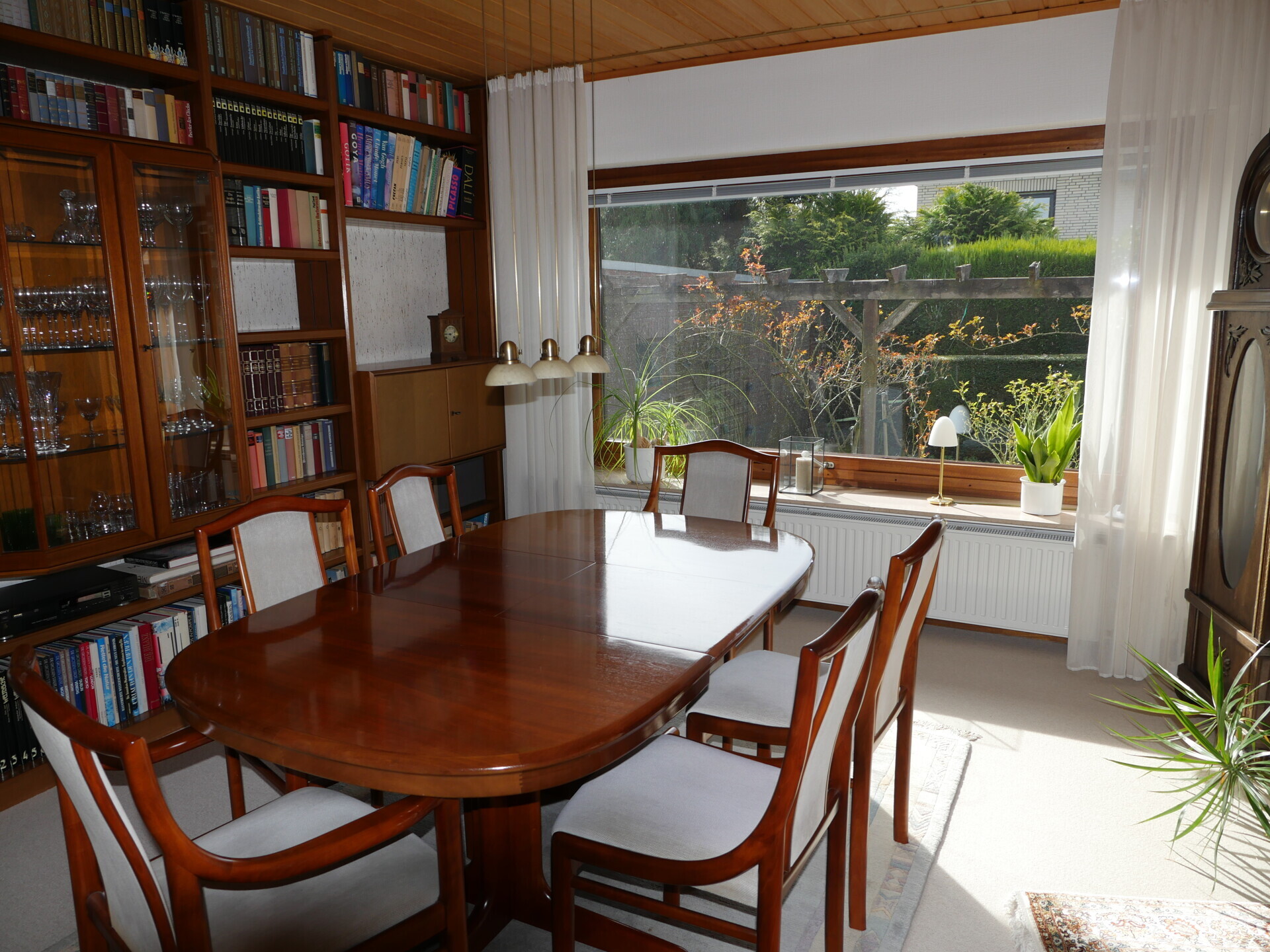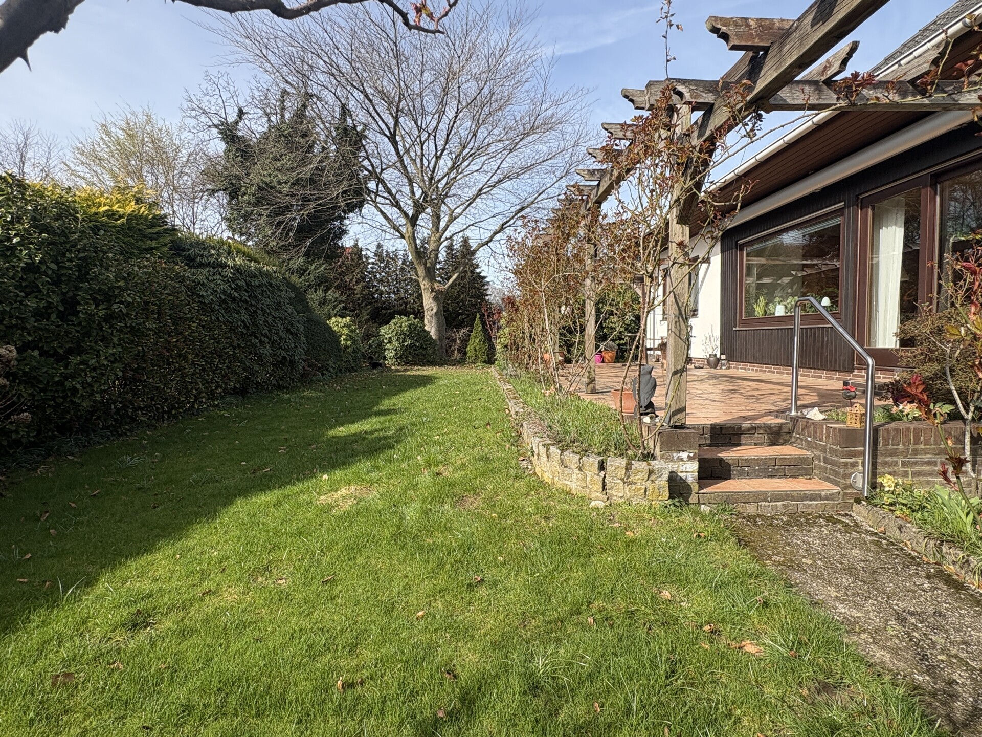 Grundstück: Das Grundstück hat eine Größe von insgesamt 791 m² und liegt in einer verkehrsberuhigte Lage am Wendehammer. Der Zugang zum Haus ist über eine 6-stufige Treppe zu erreichen. In den Garten gelangt man nur über die Durchgangstür neben der Garage, er ist durch eine hohe Thujahecke abgeschirmt - d.h. nicht einsehbar und geschützt. Eine schöne Rotbuche, eine weiße Magnolie und ein Gingko-Baum bieten besondere Blickfänge, und zu dieser Jahreszeit beginnt die Blüte der Rhododendren. Der Zugang zur großen Terrasse mit Pergola ist durch eine 3-stufige Treppe zu erreichen.