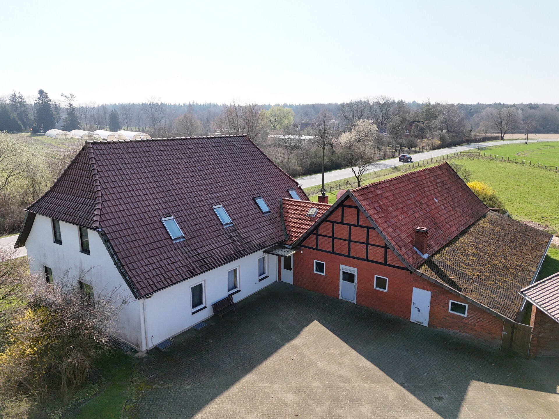 Grundstück: Das Grundstück hat eine Gesamtgröße von 5.306 m³ und liegt in Einzellage idyllisch zwischen Feldern und Wald. Das Wohnhaus und die Nebengebäude sind umgeben von großzügigen Rasenflächen. Diese bieten viel Platz für Spielgeräte wie Schaukeln, Trampoline oder Klettergerüste. Aber natürlich auch zur Anlage von Blumenbeeten, Hochbeeten oder gemütlichen Sitzecken zum Verweilen. Hinter dem Gebäudeensemble schließt sich eine umzäunte Weidefläche an, so dass hier auch Kleintierhaltung möglich ist. Die Siedenburger Straße als übergeordnete Verbindungsstraße erinnert daran, dass eine gute Verkehrsanbindung zur B6 und auch zur B214 vorhanden ist.