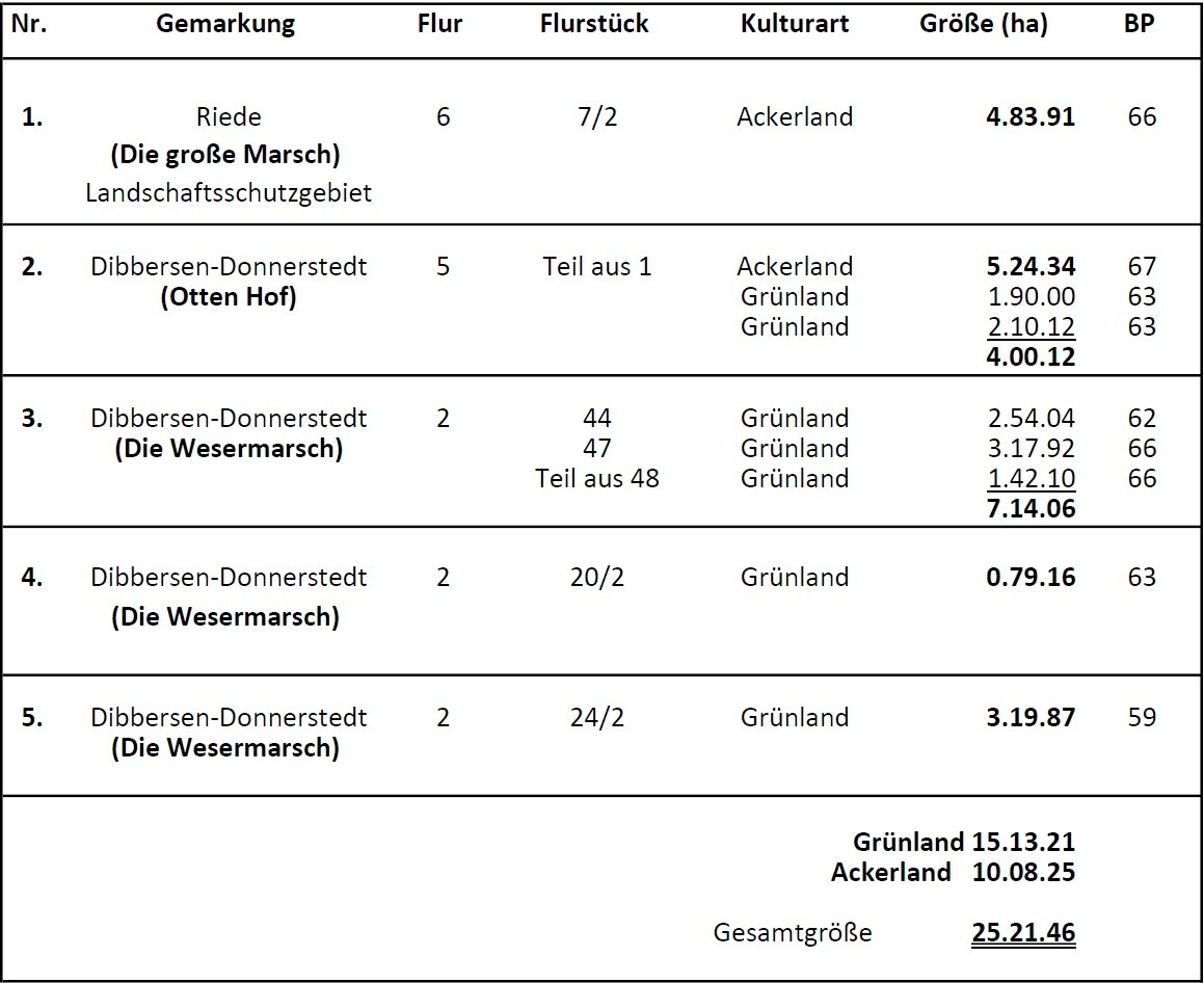 Im Alleinauftrag verpachten wir in der Gemarkungen Riede und Dibbersen-Donnerstedt ca. 10 ha Ackerland und ca. 15 ha Grünland. Der Pachtvertrag soll auf 6 Jahre abgeschlossen werden und beginnt am 01.10.2026. Die genaue Lage entnehmen Sie bitte den Lageplänen, die Größen der Flächenaufstellung und den Auszügen aus den Liegenschaftsbüchern. Die Verpachtung erfolgt nach Höchstgebot im Ganzen oder geteilt. Bitte rufen Sie uns bei Interesse, Fragen oder zur Abgabe eines Gebotes an.