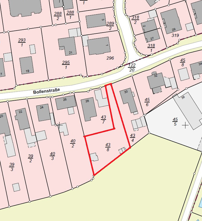 Der Garten diente jahrelang einem ortsbekannten Blumengeschäft zur Versorgung des Ladens mit Blumen und als Rückzugsort für die Familie. Erschließung: Der Bauplatz ist erschlossen. Die Käufer zahlen noch die üblichen Hausanschlusskosten (Wasser, Strom und ggfs. Gas). Die Käufer tragen weiterhin die Kosten für den Anschluss an die Kanalisation. Baulast: Im Baulastenverzeichnis ist eine Baulast für das Grundstück eingetragen: Die Flurstücke 43/7 und 43/8 der Flur 29 der Gemarkung Bruchhausen-Vilsen gelten als ein Baugrundstück im Sinne von § 4 Abs. 1 der Niedersächsichen Bauordnung. Zufahrt: Aufgrund der langen Zufahrt zur eigentlichen Baufläche muss ggfs. die Zustimmungserklärung der Nachbarn (Eigentümer der Grundstücke) für die Bebauung vorliegen. Eine Bebauung des Grundstücks ohne Zustimmungserklärung ist unter besonderen Voraussetzungen eventuell möglich. Hausnummer: Das Grundstück erhält die Hausnummer: 28a. Bodenrichtwert: In den vergangenen Jahren sind die Bodenrichtwerte deutlich gestiegen, was auf die sehr zentrale und gleichzeitig ruhige Lage in der "Bollenstraße" zurückzuführen ist. Der Bauplatz ist als außergewöhnlich zu bewerten, da vergleichbare Grundstücke in Bruchhausen-Vilsen kaum vorhanden sind. Es handelt sich um eine rückwärtige Baulücke mit Blick auf unbebaute Naturflächen. Der Bodenrichtwert beläuft sich derzeit auf 130 Euro/m². Räumung: Die auf dem Grundstück stehenden Baulichkeiten werden vom Käufer übernommen. Eine Räumung erfolgt nicht.