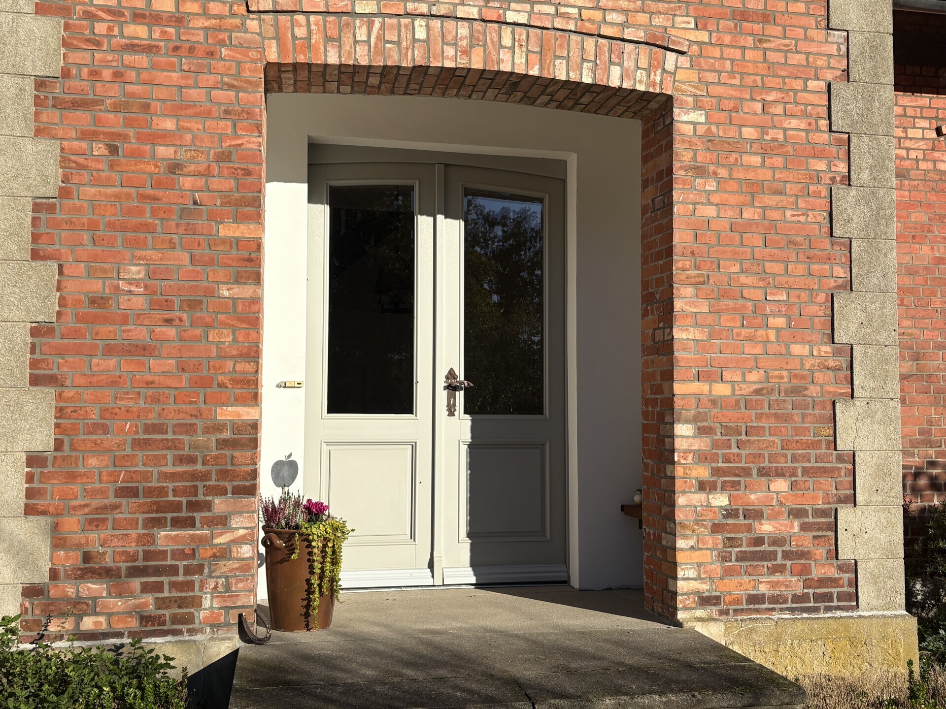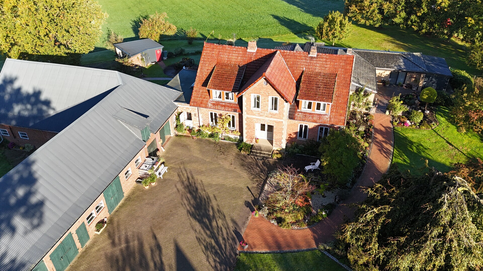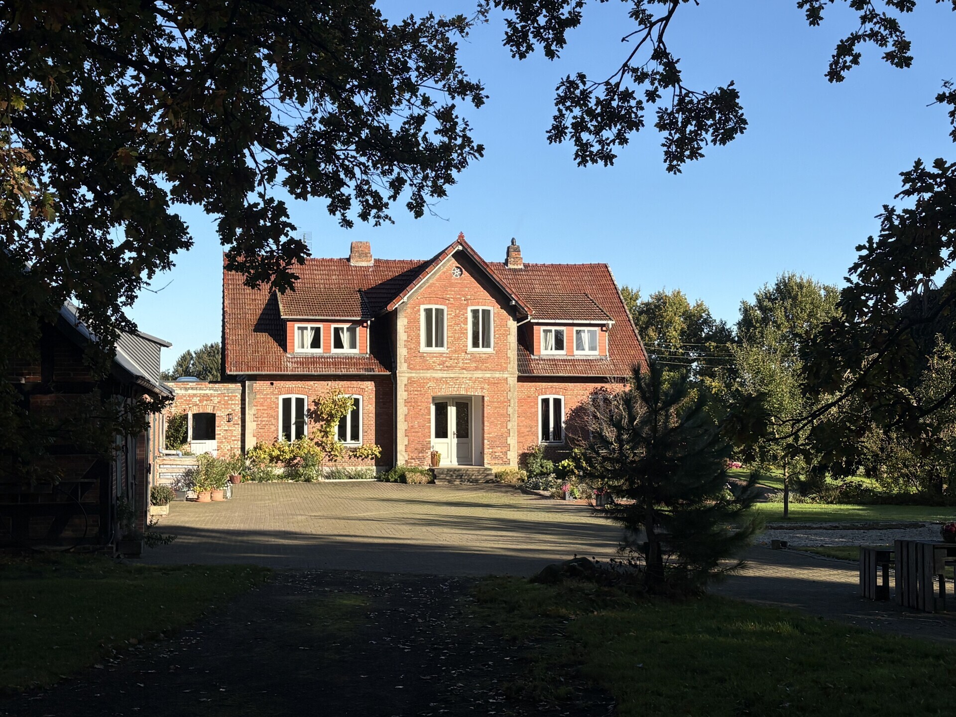 Das Landhaus befindet sich zentral auf dem Hofgrundstück und fügt sich harmonisch in die Umgebung ein. Mehrere mächtige, alte Eiche prägen den Hofcharakter und verleihen dem Standort eine besondere Atmosphäre. Vor dem Haus lädt eine einladende Terrasse zum Verweilen ein, gesäumt von verschiedenen Ziersträuchern und Rosen. Auf dem gesamten Grundstück zeigt sich die Liebe zum Detail: mehrere Rosensträucher, teils direkt an der Hauswand, teils verteilt auf dem Grundstück, sorgen je nach Jahreszeit für eine romantische Atmosphäre. Ein hübscher Pavillon ergänzt das Ensemble und bietet einen gemütlichen Platz zum Entspannen, Lesen oder Kaffeetrinken im Grünen. Die großzügige Hoffläche ist vollständig gepflastert und sorgt für eine praktische Verbindung zwischen Wohnhaus, Nebengebäude und Garten. Nebengebäude: Direkt angrenzend an das Landhaus liegen die ehemaligen Stallungen – einst landwirtschaftlich genutzt, bieten sie heute viel Raum für Ihre Ideen.