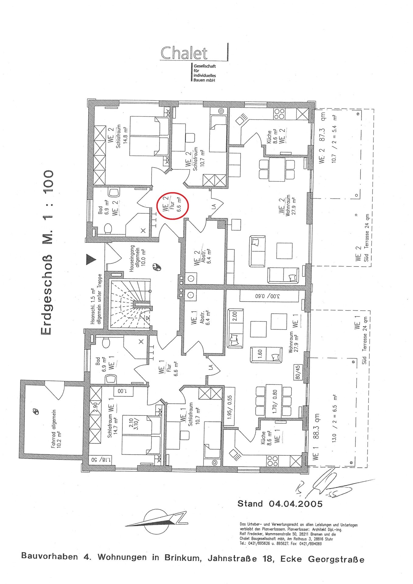 Das 4 Parteienhaus wurde 2005 von der Chalet Baugesellschaft mbh aus Stuhr errichtet. Die Wohnung befindet sich im Erdgeschoss und ist hochwertig ausgestattet, gut geschnitten und in einem gepflegtem Zustand. Die Wohnung hat 3 Zimmer und eine große Terrasse mit Süd-Ausrichtung. Die Raumaufteilung ist harmonisch, hell und gelungen, so dass man sich gleich wohl fühlt. - Außenfassade verputzt - Außenrollläden vor Kunststofffenstern - teils bodentiefe Fenster - Bodenbeläge: Fliesen, Teppich, Teakholzboden im Wohnzimmer - Fenster: Kunststofffenster mit Außenrollläden - Badezimmer mit Dusche, Toilette, Waschbecken, Handtuchheizkörper und Fußbodenerwärmung - Waschmaschinenanschluss im Abstellraum - Einbauküche. Haustechnik: Niedertemperatur-Gasbrennwertkessel (2005), Kanal, öffentliches Wasser, Elektrizität, Telefon. Im Wohnzimmer befindet sich ein Ofen - es ist nicht bekannt, ob der Ofen die Vorgaben nach dem Bundesimmisionsschutzgesetz (BimSchV - Stufe 1 und 2) erfüllt. Hausverwaltung: Die Wohnanlage wird durch einen Eigentümer der Hausgemeinschaft verwaltet. Eine Verwalterzustimmung ist für den Verkauf der Wohnung nicht notwendig. Übergabe: Die Wohnung ist frei. Da es sich um eine Betreuung handelt, muss das Gericht den Kaufvertrag genehmigen. Die Abwicklung des Vertrages und die Übergabe können sich dadurch verzögern!